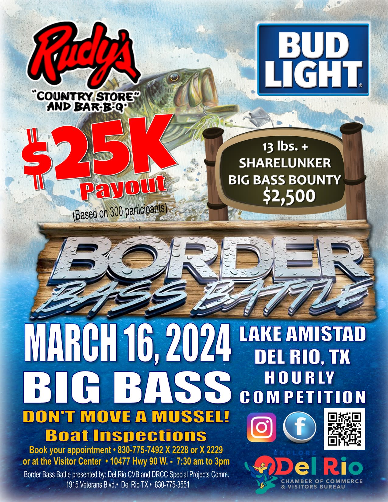 Border Bass Battle is an hourly big bass tournament held semi-annually at Lake Amistad in Del Rio, TX. Register unlimited participants per boat early or registration meet up at Rudy's BBQ on Nov 15, 4-9pm. Hourly prizes and overall fish payout, along with 13lb ShareLunker. Register online now! Presented by the Del Rio Chamber of Commerce