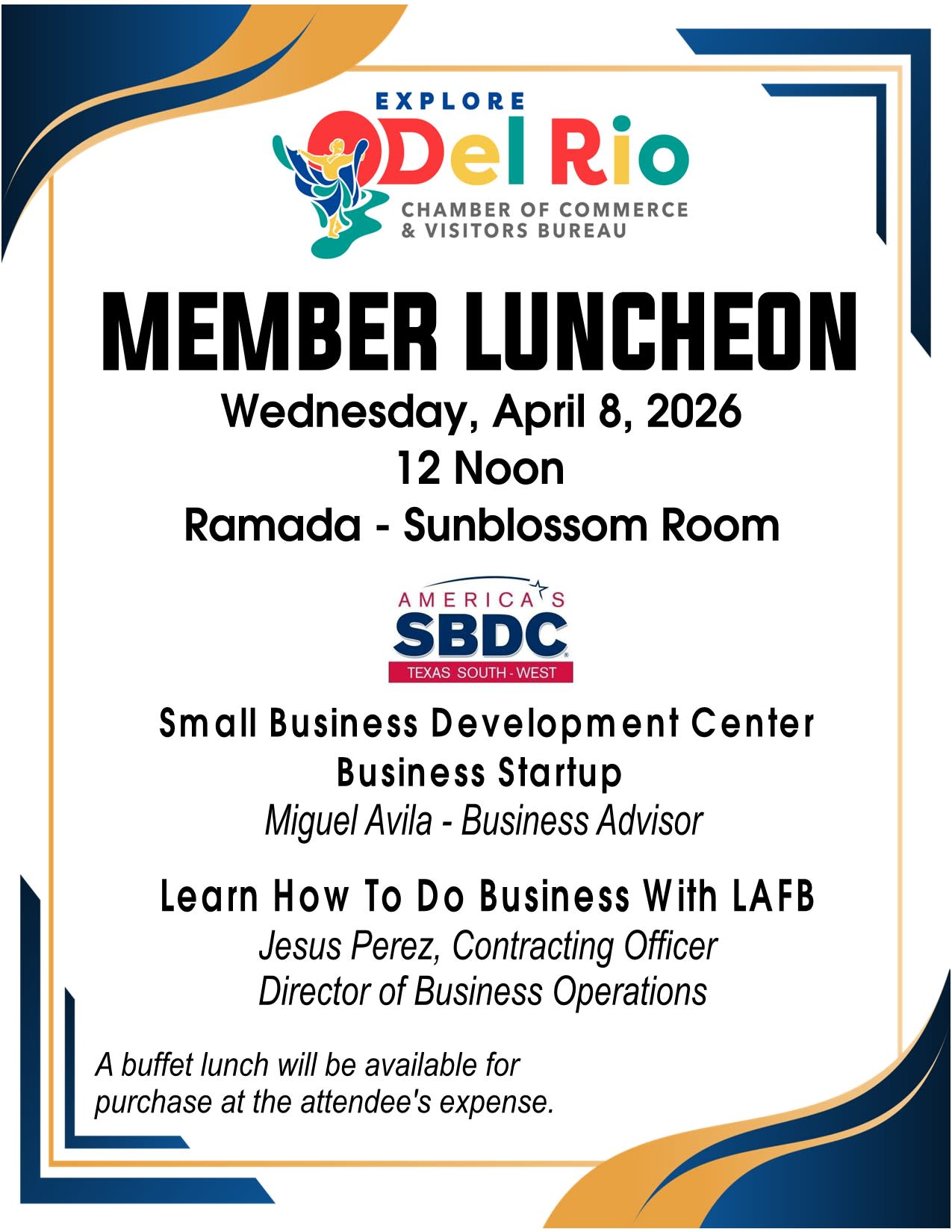 Have Lunch with fellow Chamber members and hear a guest speaker that will interest you and our community every second Wednesday of the month at noon in the Ramada Sunblossom Room.