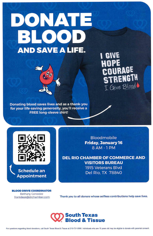 Donate Blood and Save a Life! January 16, 8am-1pm at the Chamber of Commerce and Visitors Bureau. Free long sleeve Shirt when donating, Schedule your appointment at https://donor.southtexasblood.org/donor/schedules/drive_schedule/152141