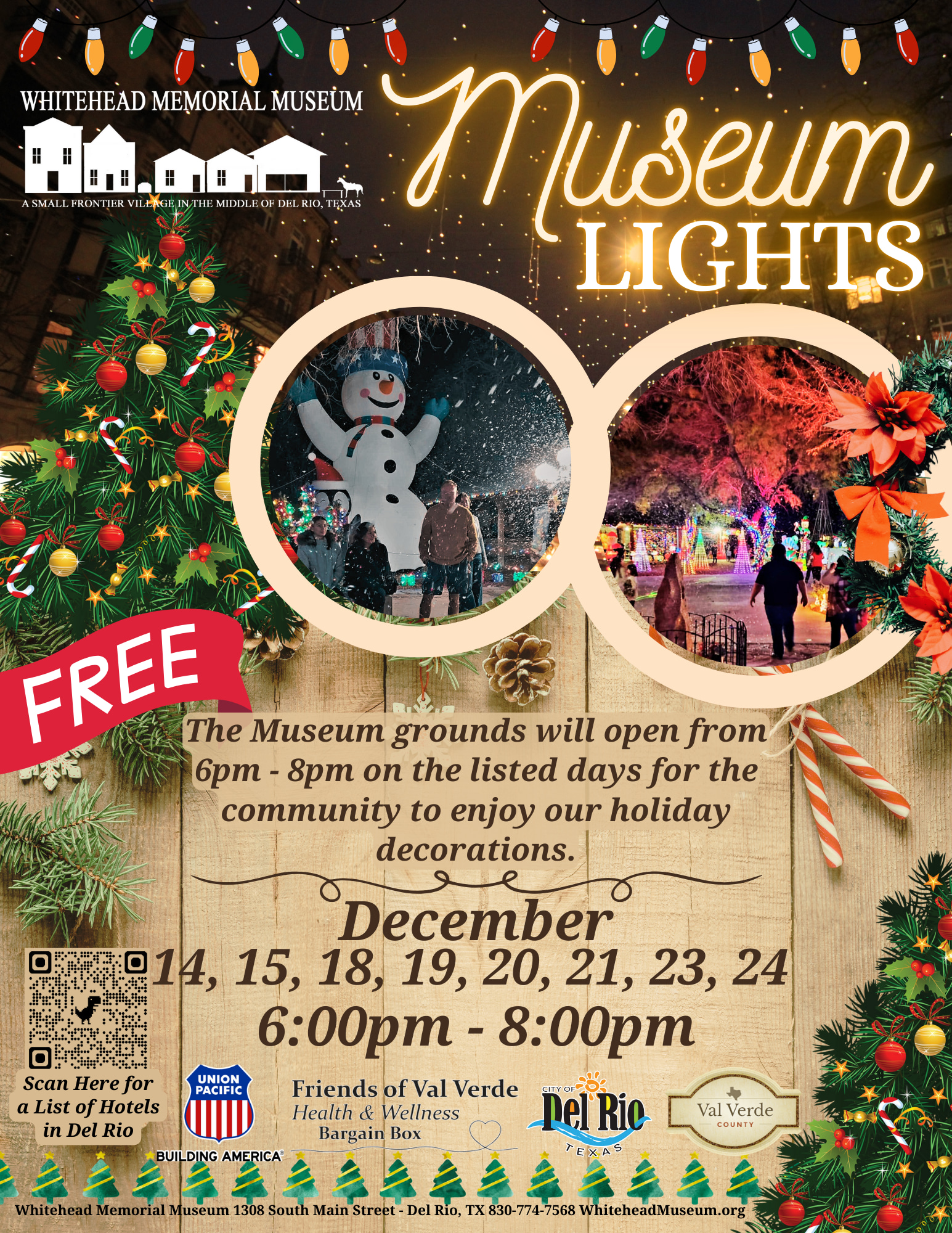 Free Event at the Whitehead Memorial Museum. The grounds will open from 6pm-8pm on December 14, 15, 18, 19, 20, 21, 23, 24 for the Community to enjoy holiday decorations.