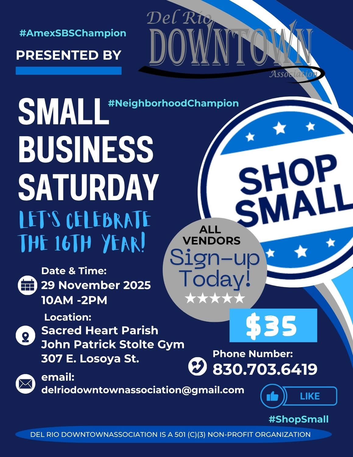 16th year Small Business Saturday Sacred Heart Parish Vendor Entry $35 Presented by Del Rio Downtown Association